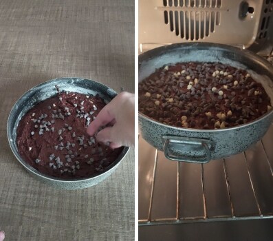 – Graisser et fariner le moule puis le remplir avec la pâte et décorer la surface avec les pépites de chocolat.