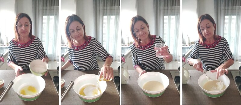– Dans un autre saladier, verser les œufs et le sucre ; puis ajouter l’huile, l’eau et le yaourt en mélangeant brièvement.
