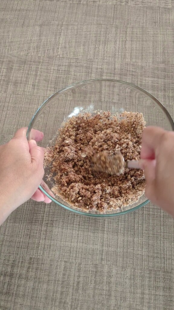 – Faire fondre le beurre et le laisser tiédir ; pendant ce temps, réduire en poudre les biscuits et les mélanger ensemble.