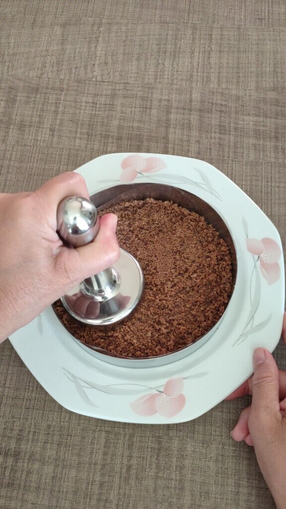 – Recouvrir l’anneau avec de l’acétate ou du papier sulfurisé, le poser sur un plateau et verser le mélange de base en lissant avec le dos d’une cuillère ou un verre (ou le pilon à viande).