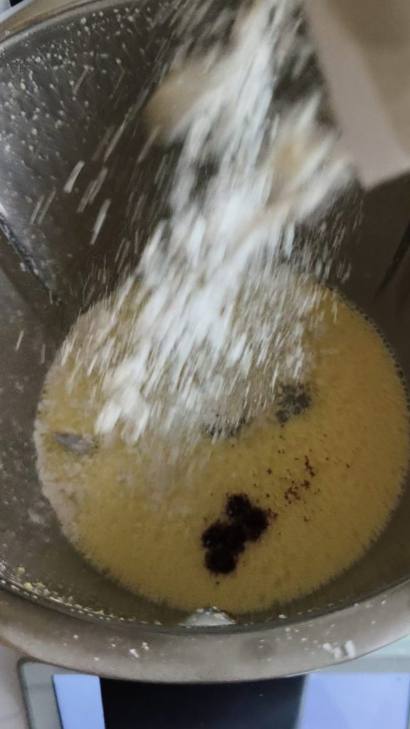 Ajoutez la vanille, la farine et la levure : 40 sec. vitesse 5, en spatulant si nécessaire.
