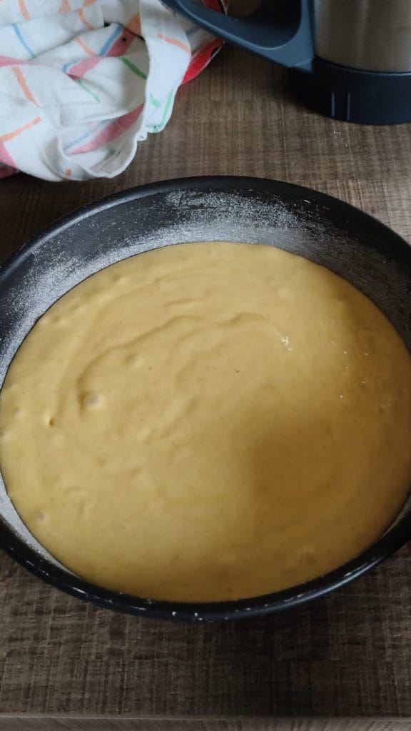 Versez la pâte dans le moule huilé et fariné et faites cuire au four statique à 170°C pendant 35-40 min. Ou avec fonction pâtisserie (dépend du four)