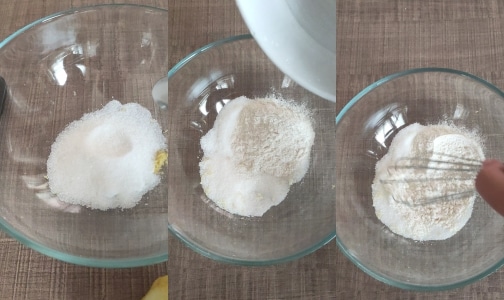 – Mettez dans un bol en verre le sucre, le zeste de citron râpé (bien lavé) et la vanille; mélangez puis ajoutez la farine.
