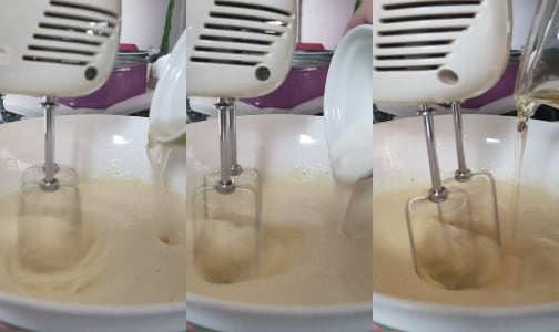 – Toujours avec les fouets en mouvement, versez le jus de citron, puis le yaourt et l’huile.