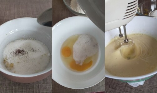 – Cassez les œufs dans un bol, ajoutez le sucre et le zeste de citron râpé et battez avec les fouets électriques jusqu’à ce que la pâte devienne claire.