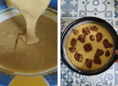– Pour éviter que la pâte à tartiner ne coule pendant la cuisson, s’assurer que la pâte finale soit bien ferme (c’est-à-dire vérifier qu’en la soulevant et en la laissant retomber, elle reste quelques secondes à la surface). Ajouter des cuillerées de pâte à tartiner sur toute la surface du gâteau et cuire dans un four chaud à 180°C pendant environ 30 minutes (le test du cure-dent est toujours valable).