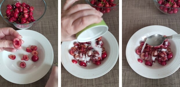 – Dénoyauter les cerises, les couper en morceaux et les rassembler dans une assiette avec le sucre et le jus du citron. Laisser macérer 10 minutes et pendant ce temps, préparer la pâte.
