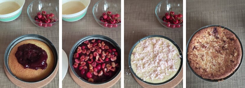 – Sortir le gâteau du four (attention à ne pas se brûler) et garnir la surface avec la confiture de cerises et les cerises. Couvrir avec le reste de la pâte et décorer la surface avec le crumble à la noix de coco. Cuire encore environ 20 minutes (faire le test du cure-dent et si la surface commence à trop brunir, couvrir avec une feuille d’aluminium et poursuivre la cuisson). Laisser tiédir puis démouler le gâteau sur le plat de service.