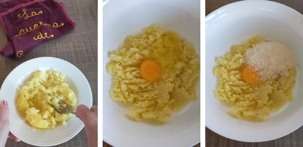 – Écraser les pommes de terre quand elles sont encore chaudes et lorsqu’elles tiédissent, ajouter l’œuf entier et le parmesan.