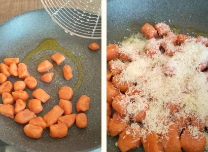– Les faire cuire dans une grande quantité d’eau salée et lorsqu’ils remontent à la surface, les égoutter et les passer dans une poêle avec un filet d’huile ; ajouter du parmesan râpé à volonté et un peu d’eau de cuisson. Mélanger et servir.