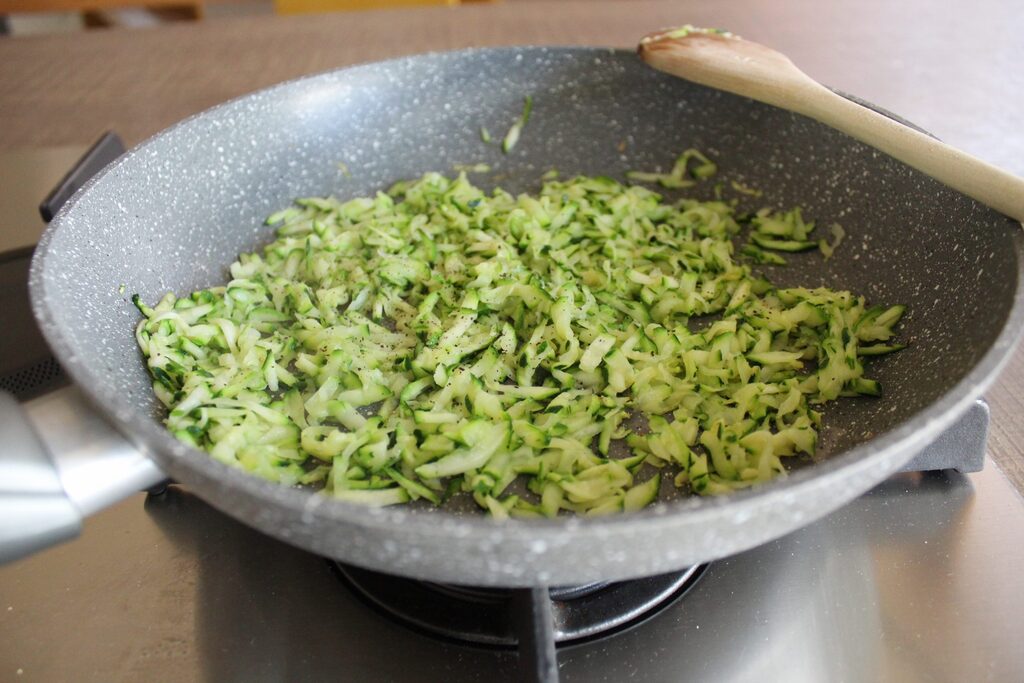 • – Faire revenir l’oignon finement émincé, ajouter les courgettes et cuire pendant environ 15 minutes. Assaisonner de sel et de poivre et éteindre.