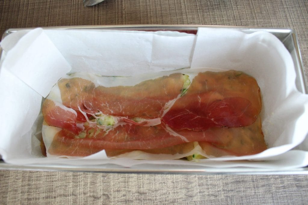 – Verser une partie du mélange de pommes de terre et courgettes, recouvrir de speck et continuer jusqu’à épuisement des ingrédients.
