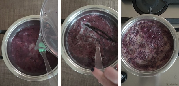 – Mettre la purée de myrtilles dans une casserole, ajouter de l’eau chaude ou froide, la vanille et porter à ébullition sans couvrir pendant 5 minutes. Éteindre, couvrir et laisser infuser pendant 2 heures (ou plus si nécessaire).