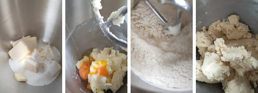 – Dans le bol du robot, mettre le sucre avec le beurre mou et le zeste de citron ; mélanger avec la feuille, puis ajouter les œufs. Une fois incorporés, ajouter la farine tamisée. Dès que la pâte se forme, arrêter la machine et poser la pâte sablée sur le plan de travail.