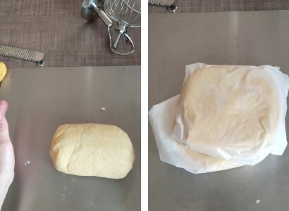 – Sans ajouter de farine sur le plan de travail, former le pâton de pâte sablée, l’aplatir légèrement et l’envelopper dans du papier sulfurisé. Mettre au réfrigérateur pendant au moins 2 heures (mieux si préparé la veille).