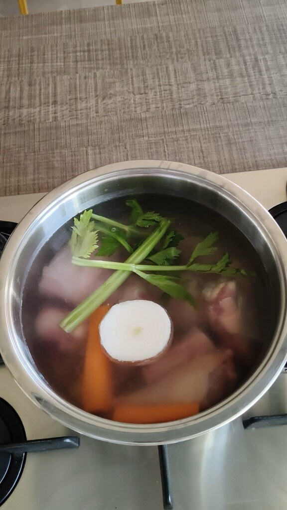 Préparer le bouillon avec la viande de dinde, le céleri, la carotte et l’oignon et couvrir.