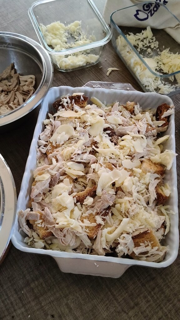 Mettre au fond du plat le pain coupé en morceaux irréguliers, puis continuer par couches.