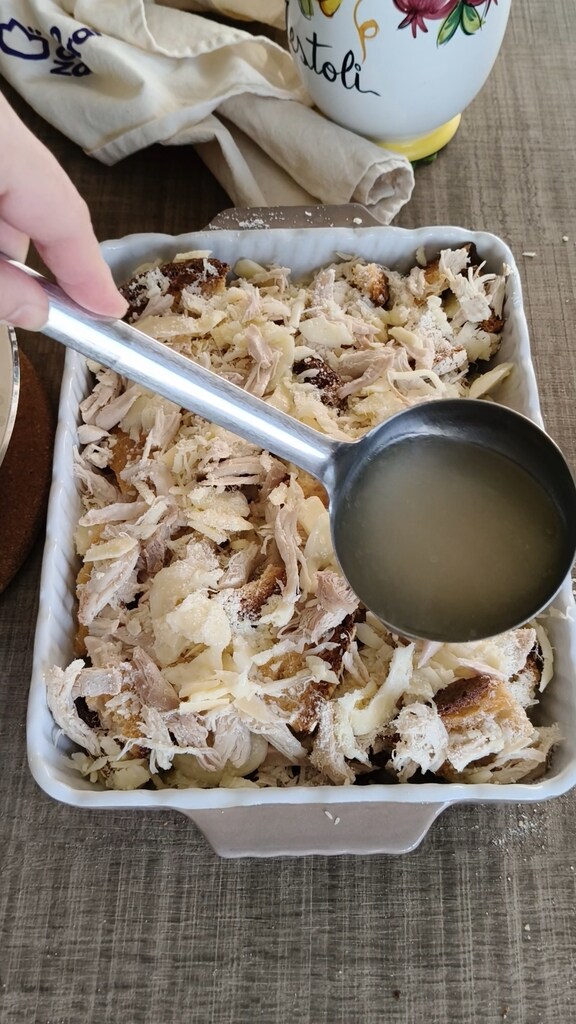 Ajouter le bouillon, environ jusqu’à la moitié du plat ou un peu plus. Il n’est pas conseillé de tout mettre, car il pourrait servir ensuite (certains convives aiment ajouter du bouillon aussi dans l’assiette). Cuire environ 20′ dans un four chaud à 200°C en couvrant le plat avec une feuille d’aluminium; puis découvrir et passer sous le grill pour faire dorer la surface.