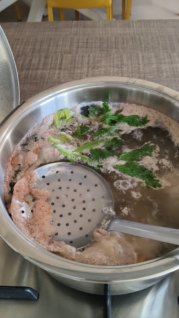 Pour faire une excellente petite soupe, il est nécessaire de partir d’un bon bouillon de dinde, qui devra être écumé et filtré. Il est conseillé de le faire la veille, et après l’avoir refroidi, il se conserve dans un récipient hermétique, au frigo, de préférence filtré.