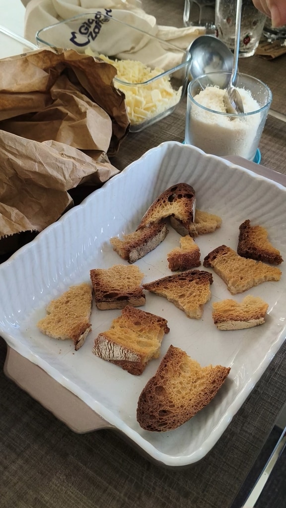 Concernant le pain, il est préférable qu’il soit de blé dur ou traditionnel, même de quelques jours. Il doit être grillé au four ou sur une grille et refroidi. Cependant, aujourd’hui, les boulangeries le vendent déjà tranché et grillé.