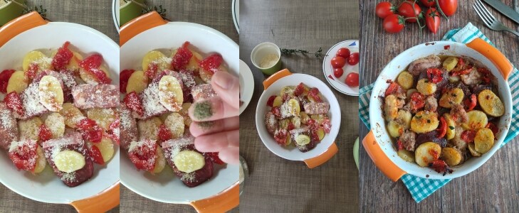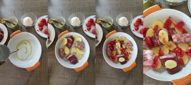 – Graissez un plat allant au four avec un filet d’huile et disposez au fond la viande, la saucisse et quelques tranches de pommes de terre ; continuez avec les tomates (lavées) à presser directement dans le plat puis assaisonnez avec une pincée de sel.