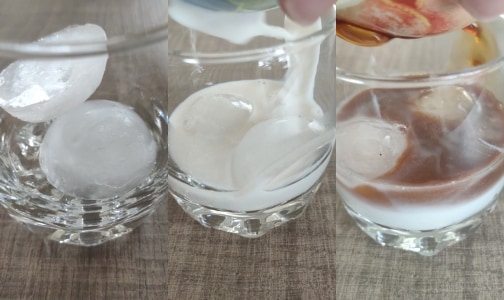 – Mettez 2/3 cubes de glace dans les verres et versez un doigt de lait d’amande (40 ml par verre)