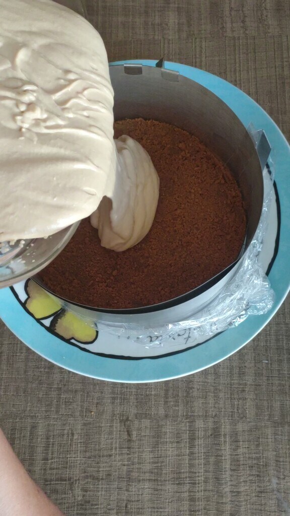 • – Verser le mélange sur la base de biscuits, lisser et placer au réfrigérateur pendant au moins 2 heures