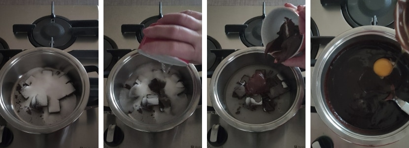 – Mettre dans une casserole, le chocolat en morceaux, le sucre, une petite tasse d’eau et la crème à tartiner. Faire fondre à feu moyen/doux et quand le chocolat sera fondu et tous les ingrédients bien amalgamés, ajouter l’œuf en l’incorporant bien avant d’éteindre.