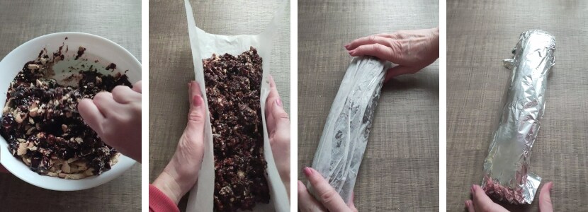 – Verser le mélange au chocolat sur les ingrédients secs et mélanger ; passer le mélange sur une feuille de papier sulfurisé et lui donner la forme d’un salami. L’enrouler également dans du papier aluminium et passer au congélateur pendant au moins 2 heures (si vous êtes pressé de le servir) ou laissez-le au réfrigérateur jusqu’à ce qu’il durcisse. Vous pouvez tout à fait le faire la veille.