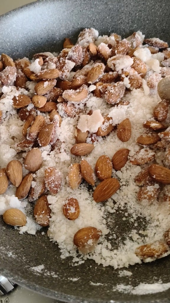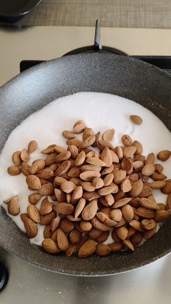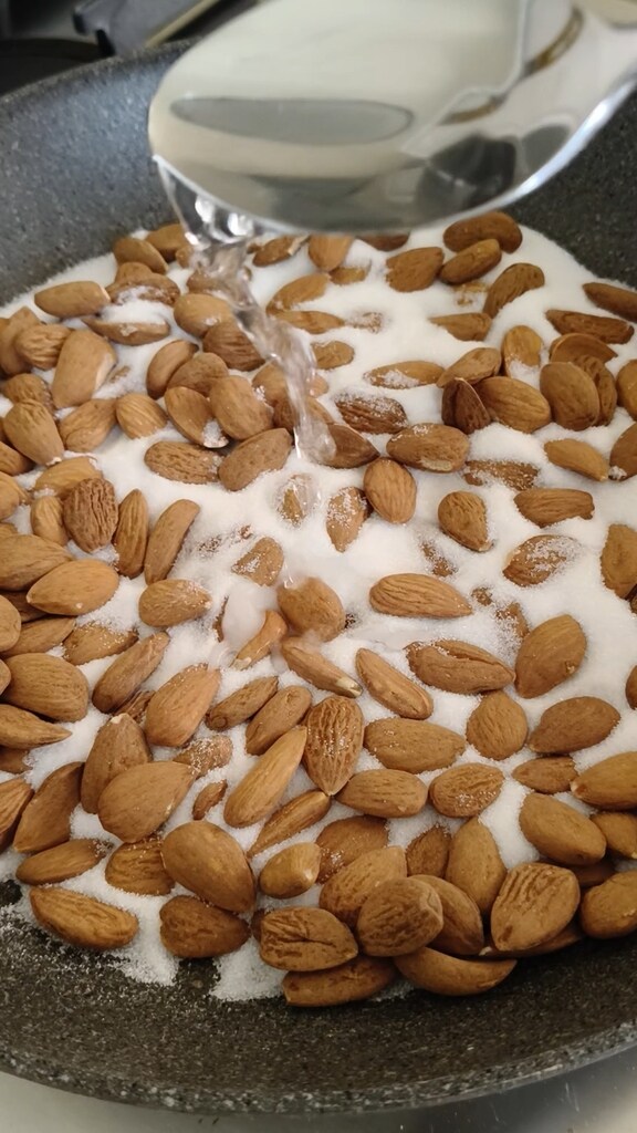 En pratique, on met sur le feu une casserole ou une poêle, on verse le sucre, les amandes grillées, de l’eau et une ou deux cuillères d’eau et on les fait caraméliser sur le feu, en remuant continuellement et en faisant attention à ne pas brûler le sucre.