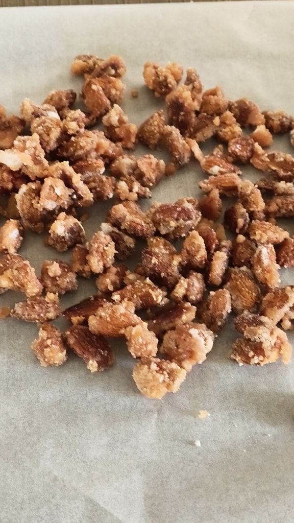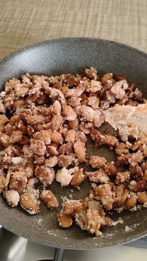 À un certain moment, le sucre commence à fondre à nouveau et donc remuer pour caraméliser les amandes. Tout le sucre ne pourra pas se dissoudre de nouveau et il ne faut pas insister, car le caramel pourrait devenir amer. Éteindre la plaque de cuisson et verser les amandes ‘mbrelline’ sur une feuille de papier sulfurisé en essayant de séparer avec deux cuillères (pas avec les mains car elles sont très chaudes) celles qui sont collées entre elles.