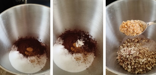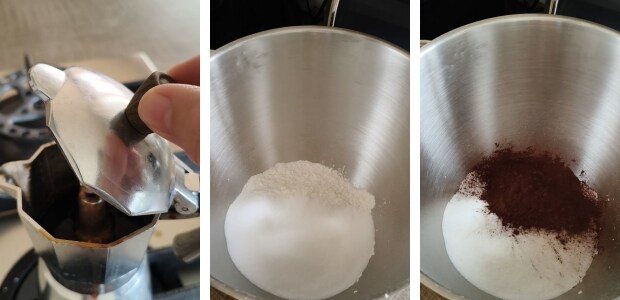 • Préparer le café et le laisser tiédir, pendant ce temps mettre dans le bol du robot pâtissier la farine tamisée, le sucre et le cacao (toujours tamisé pour éviter les grumeaux).