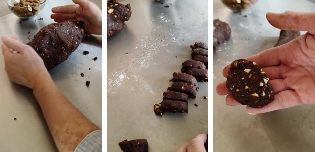 • Former un boudin avec la pâte sur le plan de travail légèrement fariné, l’aplatir légèrement et découper les biscuits.