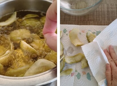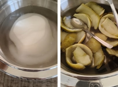 Faire bouillir de l’eau propre et laisser bouillir les zestes jusqu’à ce qu’en piquant avec un cure-dent, la consistance devienne moelleuse.