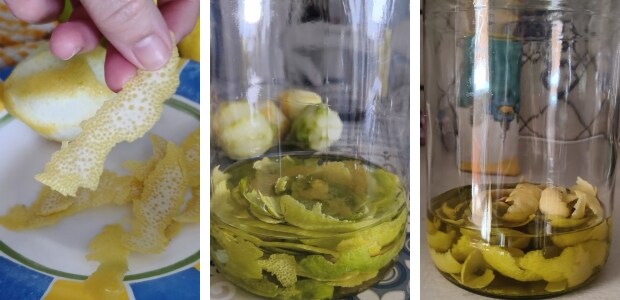 – Laver bien les citrons et, à l’aide d’un économe, prélever le zeste jaune en évitant autant que possible la partie blanche ; mettre les zestes dans un bocal hermétique, verser l’alcool, fermer et ranger dans un placard pour 3 jours, en prenant soin de l’agiter de temps en temps.