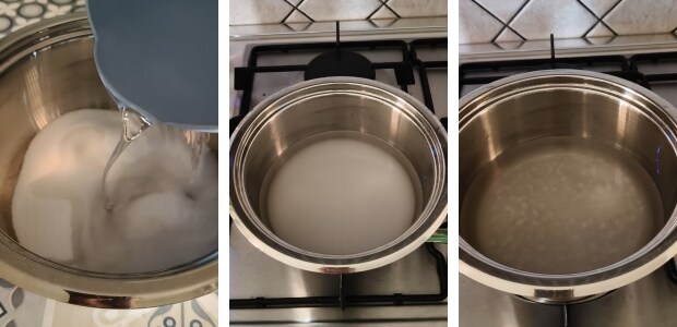 – Une fois le temps écoulé, préparer le sirop en faisant bouillir le sucre dans l’eau, jusqu’à ce qu’il soit complètement dissous ; le laisser refroidir.