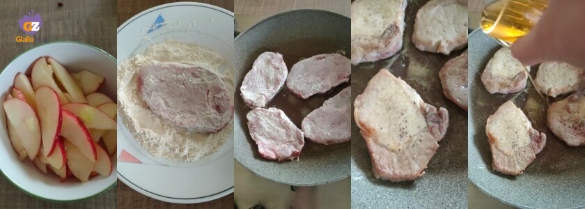– Chauffer la poêle avec l’huile et pendant ce temps fariner les tranches; cuire environ 5′ de chaque côté, puis saler, poivrer et déglacer avec un peu plus de la moitié de la liqueur. Attendre que l’alcool s’évapore et retirer la viande de la poêle (en la mettant momentanément dans une assiette).