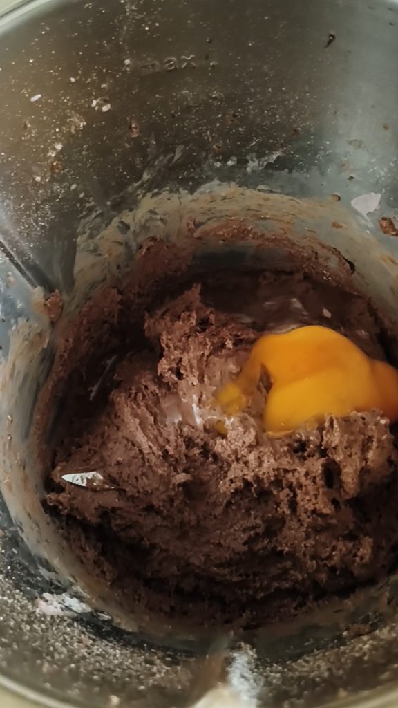 La pâte est à base de farine d’avoine, de cacao amer et de yaourt aux myrtilles (celui que j’avais au frigo), qui apporte une note fraîche et légèrement fruitée, sans besoin de grandes quantités de sucre.