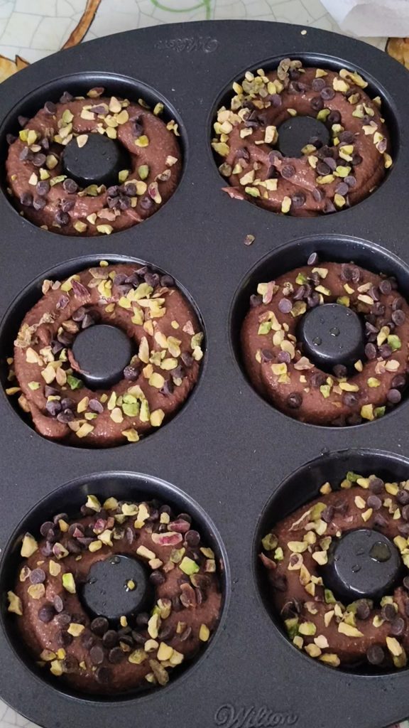 Pour distinguer ces beignets des versions classiques au cacao, j’ai choisi de ne pas incorporer les pépites à la pâte, mais de les répartir uniquement en surface avec la pistache concassée.