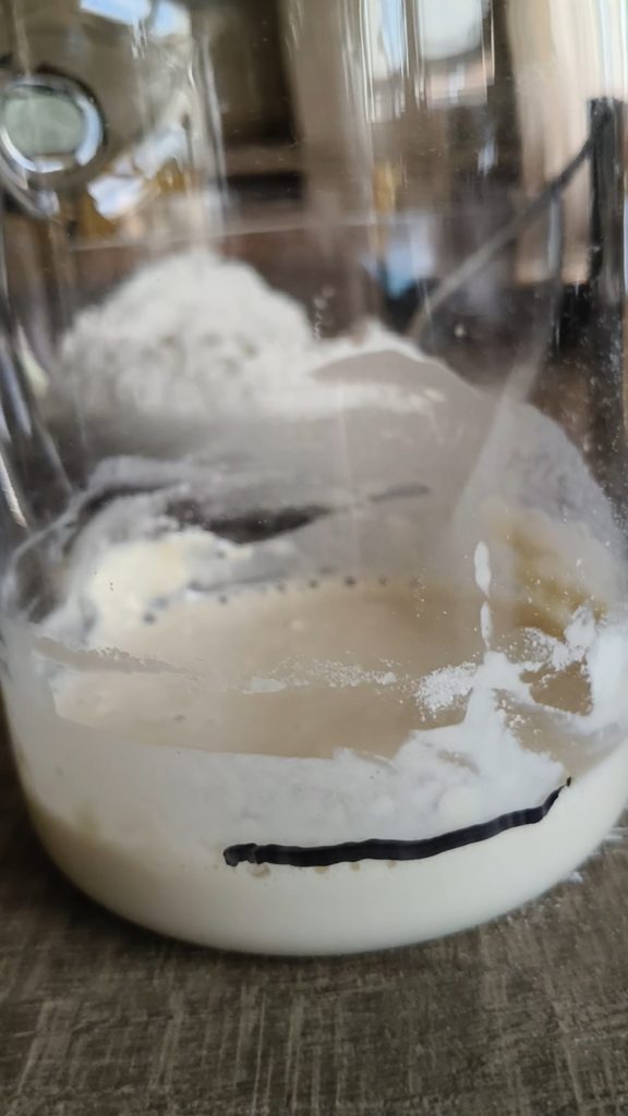 • Mélanger, marquer le point de départ, couvrir avec une gaze ou un peu de film plastique et attendre le doublement. (environ 1 heure, cela dépend de la température de la cuisine)