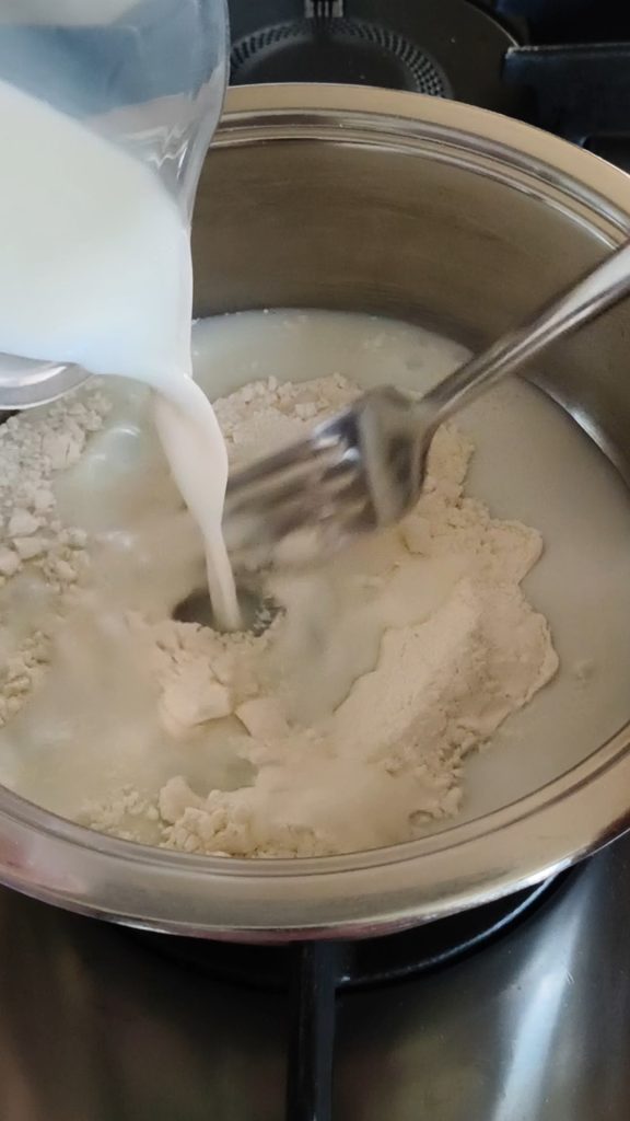 • Verser dans une petite casserole la farine tamisée et le lait, mélanger et allumer le feu à basse température.