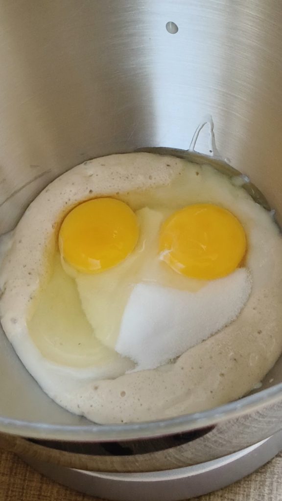 • Verser dans le bol du robot le levain, le milk roux, le sucre, la farine (moins 1 cuillère) et les œufs et commencer à pétrir avec la feuille.