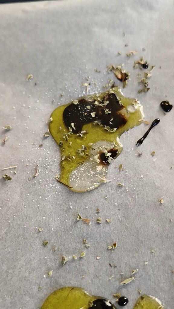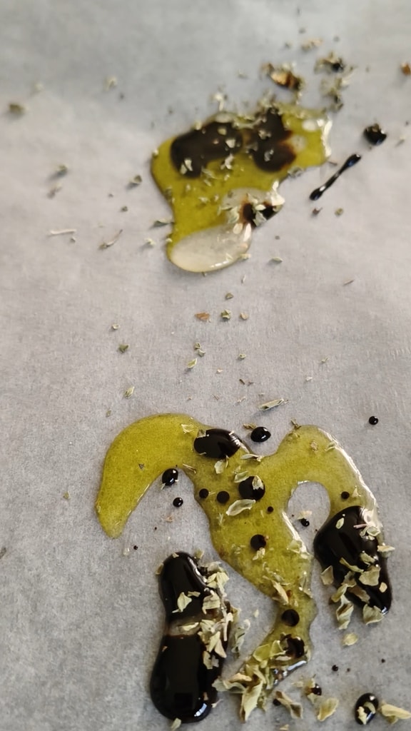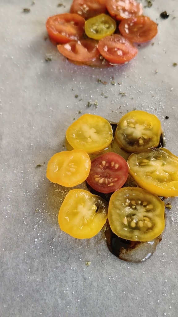 Étaler une feuille de papier sulfurisé sur la plaque et verser là où nous allons placer les tomates, huile, vinaigre balsamique, miel et origan.