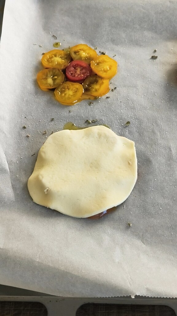 Placer sur chaque fleur de tomates une découpe de pâte feuilletée et essayer de la recourber dessous pour éviter que les liquides ne s’échappent à la cuisson.