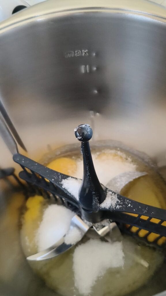 Insérer le papillon dans le bol, verser les œufs et le sucre. Fermer avec le couvercle et le gobelet doseur et fouetter 3 minutes à vitesse 3,5