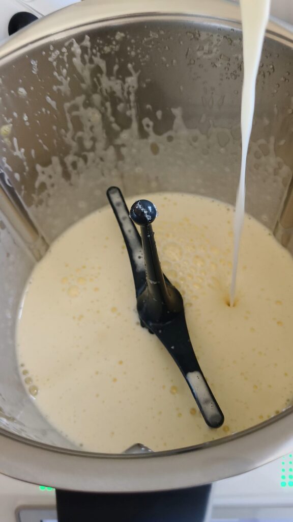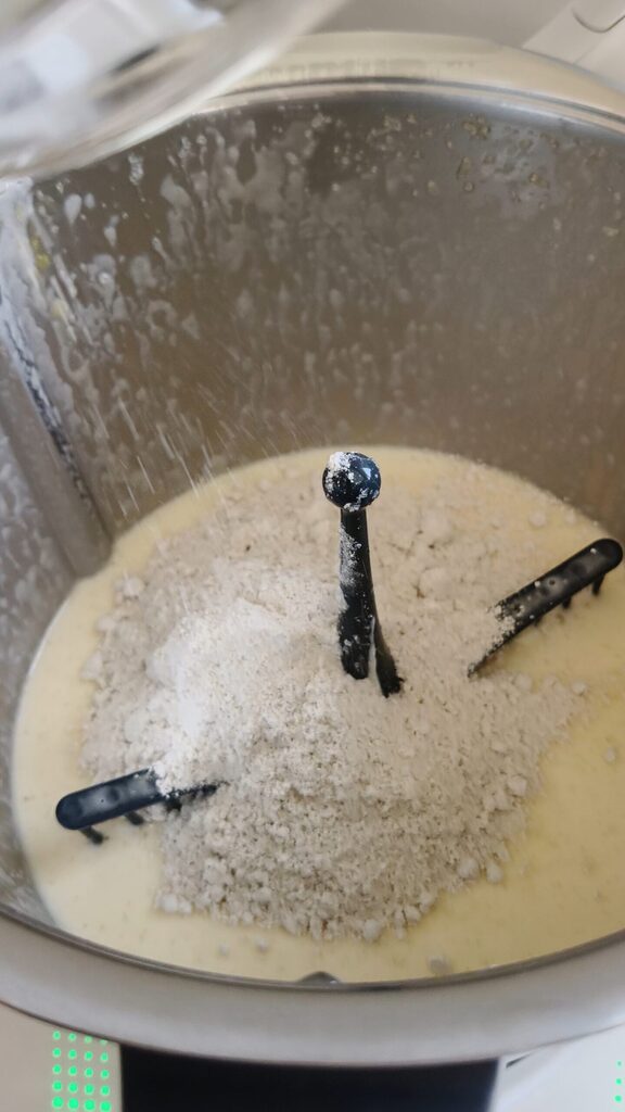 Je l’ai pétri avec le Thermomix, comme je fais dernièrement pour la commodité, mais la recette peut être suivie facilement sans : un bol, un fouet et quelques minutes de plus suffisent. (Tu trouveras le procédé dans les F.A.Q.)