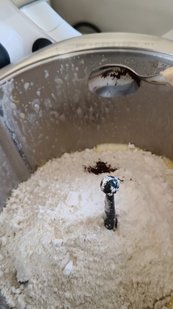 Enfin, ajouter la vanille : 40 secondes/vitesse 4 (si la pâte est trop épaisse, on peut ajouter une cuillère de lait en plus).