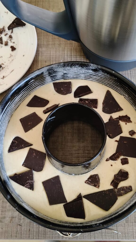 Verser la pâte dans le moule à gâteau graissé et décorer la surface avec les morceaux de chocolat.