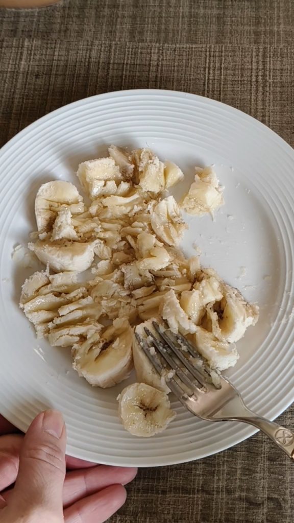 Mélanger à la fourchette, dans un bol, la banane écrasée, l’œuf et la boisson végétale.
