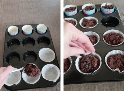 – Verser une louche ou 2 cuillères à soupe de pâte dans les caissettes à muffins, décorer la surface avec des pépites de chocolat et cuire environ 17′ (test du cure-dent)